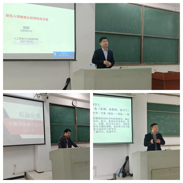 科大国祯暨合肥城市云数据中心股份有限公司技术总监、2001级计算机科学与技术专业毕业生刘宇深情回顾了在母校求学的难忘经历以及毕业十多年以来的工作历程。他表示,在工作中必须始终有居安思危的意识,不放松警惕,在顺境中勇往直前,在逆境中保持自我。安徽国泰新点软件股份有限公司公共研发部工程师、2015级软件工程专业许海峰从大学生涯、求职经历、工作经历以及人生感悟四个方面为同学们做了分享。他强调,学好专业知识,这是求职成功的根本。他鼓励同学们珍惜大学时光,认真学习专业知识,同时要保持积极乐观的态度,决不能因为一两次的失败而怀疑自己。合肥一六八中学高三班主任、2006级数学与应用数学(师范)专业毕业生章春有着丰富的教学经验和带班经验。“学乃教育之基础,德乃教育之根源。”他从自身教学经验出发,强调德育和美育要相结合,要教给学生研究数学问题的一般方法,培养他们研究问题的能力。