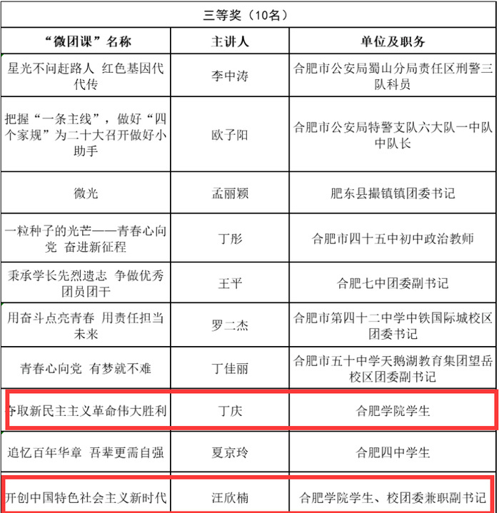 为迎接和学习宣传贯彻党的二十大,庆祝中国共产主义青年团成立100周年,激励广大团员青年砥砺前行、展示青春风采,共青团合肥市委围绕“喜迎二十大 永远跟党走 奋进新征程”主题,组织开展了优秀微团课评选活动。近日,评选结果公布,我校2件学生作品荣获三等奖。