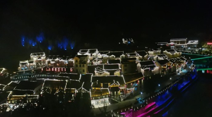 当夜幕降临,房灯、街灯、多彩景观灯,一盏盏灯次第亮起,小山村瞬间璀璨无比。漫步修竹溪畔,水映灯火,风动影摇,夜色迷人。