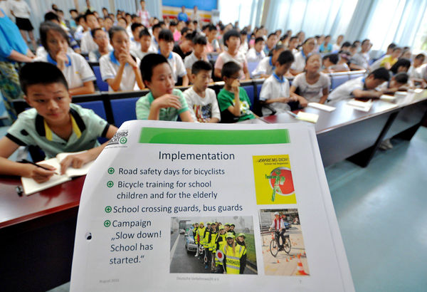 博德维希教授与在场的七年级学生进行提问互动。同学们提出了诸如“中学生如何安全到学校”“无牌照摩托车是否可以上路”“没有自行车道自行车该往那行驶”等问题,教授以幽默风趣的语气耐心解答了每个提问。他告诉大家,中学生骑自行车上学时,要注意红绿灯的转换,看清“红灯停,绿灯行”的规则。每个人都应该知道保护自己,坐公交车要小心,别使劲挤,记得“等一等”。讲座后,他还为十多位对交通安全知识感兴趣的同学详细讲述了德国针对学生群体的交通措施,如对学生进行安全测试,检查是否遵守交通规则;为了保护学生骑自行车安全抵达学校,学生在上学期间会统一穿上一种黄色制服等。