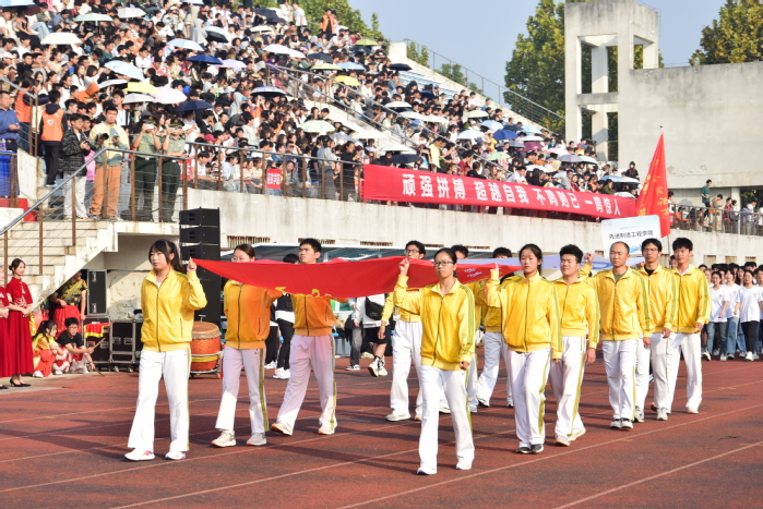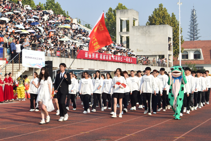 校国旗队方阵托举国旗率先入场,伴随着雄浑壮阔的《运动员进行曲》,各二级学院、留学生、研究生代表队紧随其后,迈着铿锵有力的步伐依次走过主席台前方。戴着红色建筑安全帽的城市建设与交通学院方阵队昂首阔步向前,能源材料与化工学院方阵携化学元素周期表尽显专业风采。“先进制造、制造先进,勇往直前、永不言败”“信笃志坚、奋勇争先,外院学子、拼搏向前”……响亮豪迈的口号声此起彼伏。整齐的步伐、挥舞的旗帜,展现着全校运动健儿们团结向上、奋力拼搏的精神风貌。