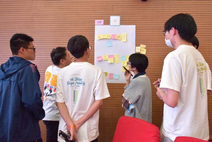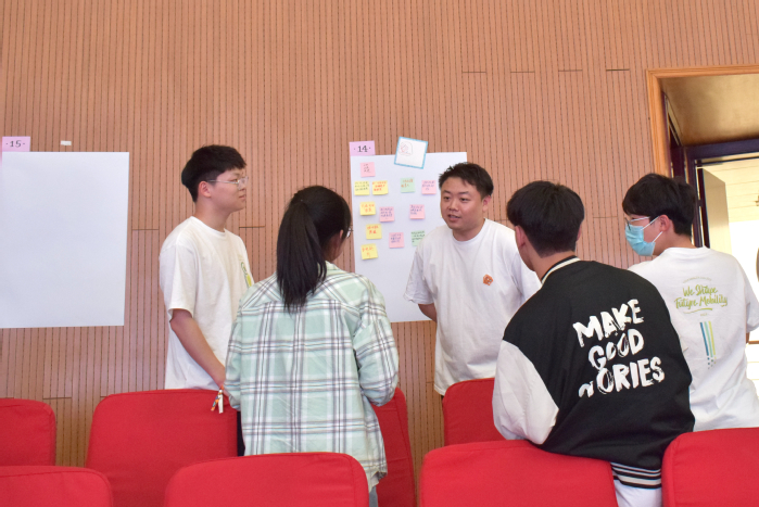 活动现场,2022“青年创想+”优胜团队之一的创想电门团队学生代表,向同学们展示了获胜方案并与同学们进行问答互动。随后,创新训练营开启,参与的同学们通过小组协作,进行团队logo的创作。导师Jamie为同学们带来设计思维课程,引导学生通过观察现实生活中的案例,以小见大的方式来激发创新性思维,并应用到2023“青年创想+”的方案创想中。参与学生围绕五大议题开展了小组讨论。现场灵感激荡,气氛高涨,参与学生把自身观察通过写在便利贴的形式进行分类和提炼。在交流展示环节,学生小组代表总结了小组讨论的议题内容,凝聚核心观点并得出结论和建议。
